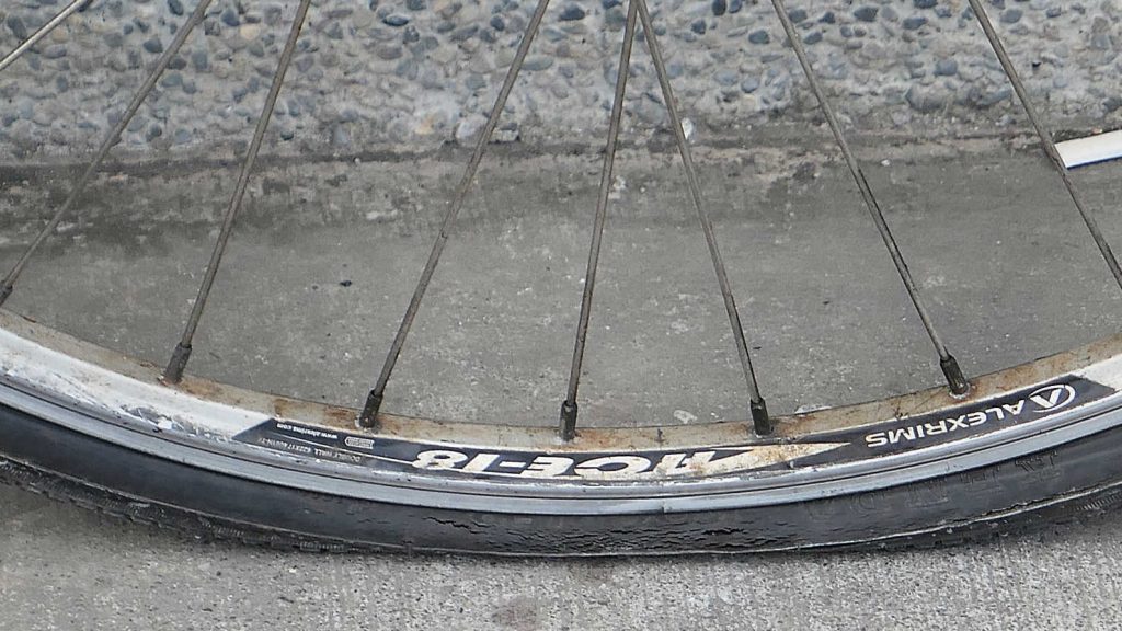 Closer view of the very used and very flat tire.